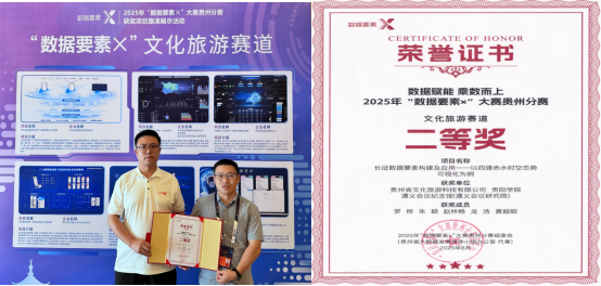 8月28日,2025年“数据要素×”大赛贵州分赛颁奖仪式在博会期间圆满落幕。贵阳学院联合贵州省文化旅游科技有限公司、遵义会议纪念馆(遵义会议研究院)共同申报的“长征数据要素构建及应用——以四渡赤水时空态势可视化为例”项目,凭借在数据要素与文化旅游融合领域的创新实践,从众多参赛项目中脱颖而出,荣获文化旅游赛道省二等奖。