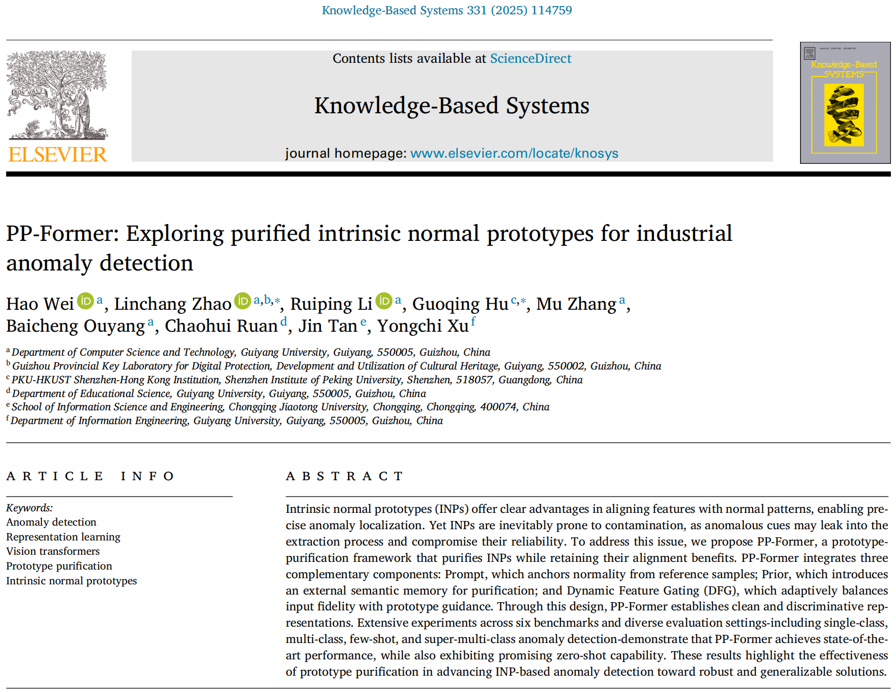 近日,我院赵林畅副教授团队研究生在国际知名期刊《Knowledge-Based Systems》(中科院1区top期刊,影响因子7.6)发表题为“PP-Former: Exploring purified intrinsic normal prototypes for industrial anomaly detection”的研究论文。 学院2023级电子信息专业大数据方向硕士研究生魏灏为第一作者,赵林畅副教授为通讯作者,贵阳学院为第一单位。《Knowledge-Based Systems》是Elsevier旗下人工智能领域的国际知名SCI期刊。它专注于知识工程与应用研究,声誉良好,审稿严格,对研究成果的创新性要求高,是许多院校认定的重要期刊。
